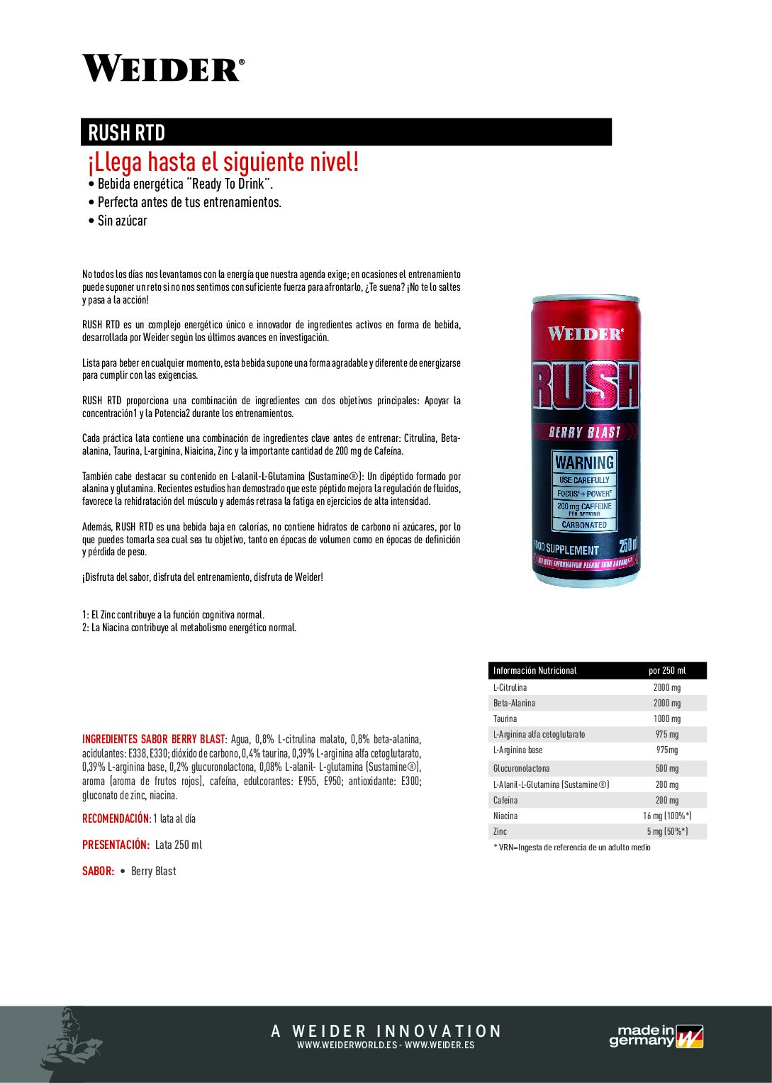 Cada lata de RUSH RTD contiene una combinación de ingredientes clave para potenciar tus entrenamientos: citrulina, beta-alanina, taurina, L-arginina, niacina, zinc y una dosis importante de 200 mg de cafeína.